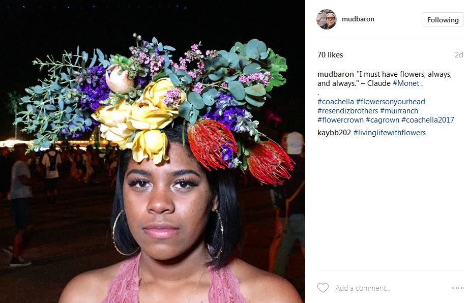 Ten fabulous photos featuring images by Pasadena’s Muir Ranch Director, Mud Baron, whose fun and unusual floral crowns were all the rage at Coachella 2017. This year, festival-goers who made the pilgrimage to Indio came equipped with festival staples—crop tops, mesh, denim, flowers and a bohemian attitude—demonstrating why Coachella has a reputation as the ancestral homeland of the festival look. There’s no doubt Mud’s floral crowns were an opportune ‘new’ fashion accessory at the festival!